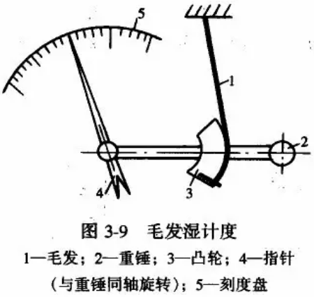 这是使用历史较久的传感器, 如最早出现的毛发湿度计。主要是根据测定材料的在不同湿度时伸缩不同进行湿度测量, 材料选用毛发、尼龙丝等。由于毛发、尼龙丝湿度敏感元件的反应速度慢,相对湿度与输出位移量的变化不成线性关系,使用的时间长久之后,易塑性变形和老化,但这种敏感元件因具有构造简单,工作可靠,价廉和不需要经常维护等优点,虽然精度不高(一般为±15%),但能满足舒适性空调等一般要求。